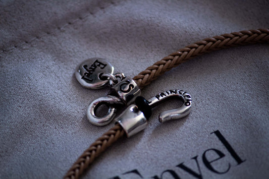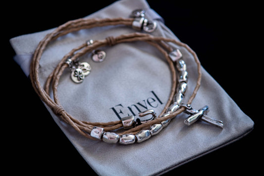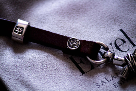 Pulsera de hebilla y piel marrón con una Cruz amarrada