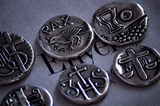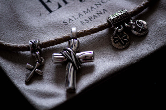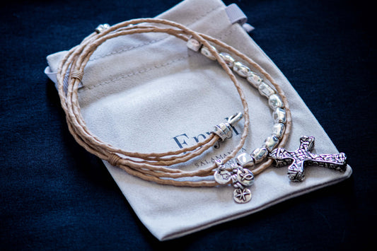 Collar Denario con Cruz Gaudí, tres medallitas en 3 cordones color claro