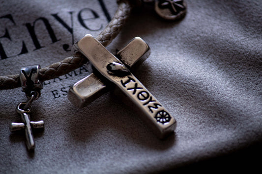 Collar Cruz formada por bloques y medallitas con cordón sintético beige