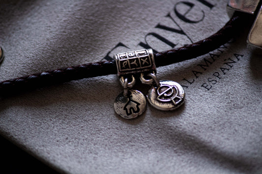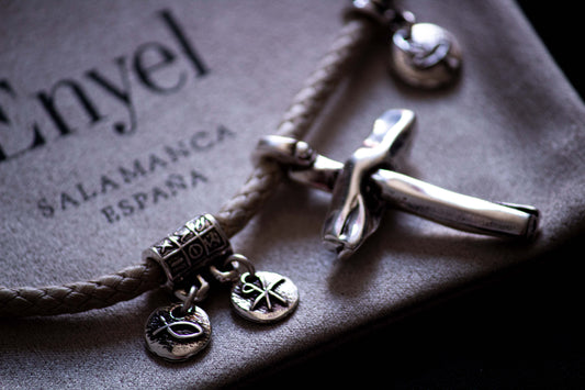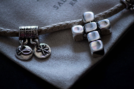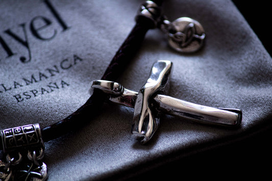 Collar Cruz Clavada y medallitas con cordón sintético marrón