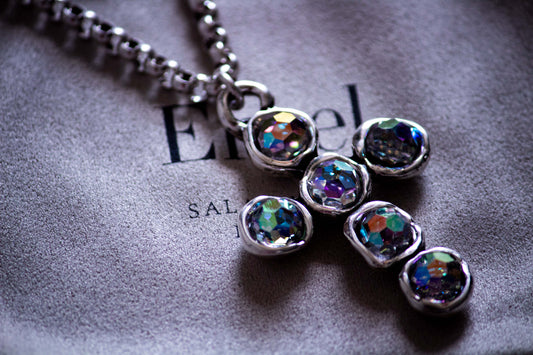 Collar con cruz, piedras multicolores y cadena en baño de plata
