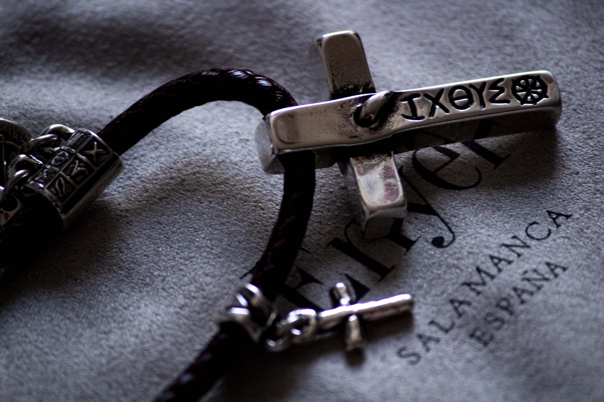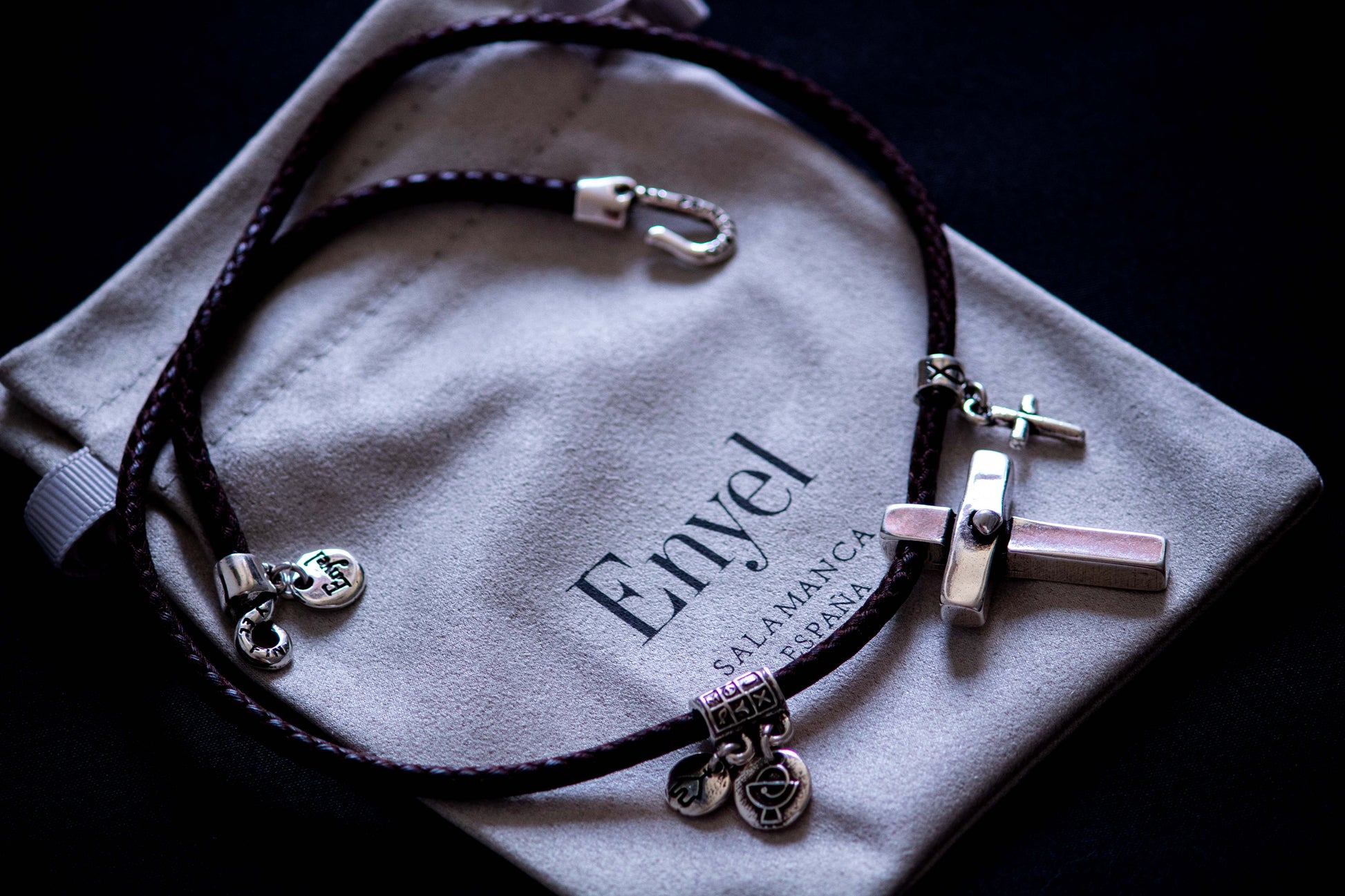 Esta joya excepcional presenta una cruz clavada con una inscripción ΙXOYΣ en la parte posterior que significa "Jesucristo, Hijo de Dios y Salvador". Las medallitas con simbología cristiana junto con el cordón sintético en tono marrón agregan al collar un toque de armonía entre lo natural y lo sofisticado.