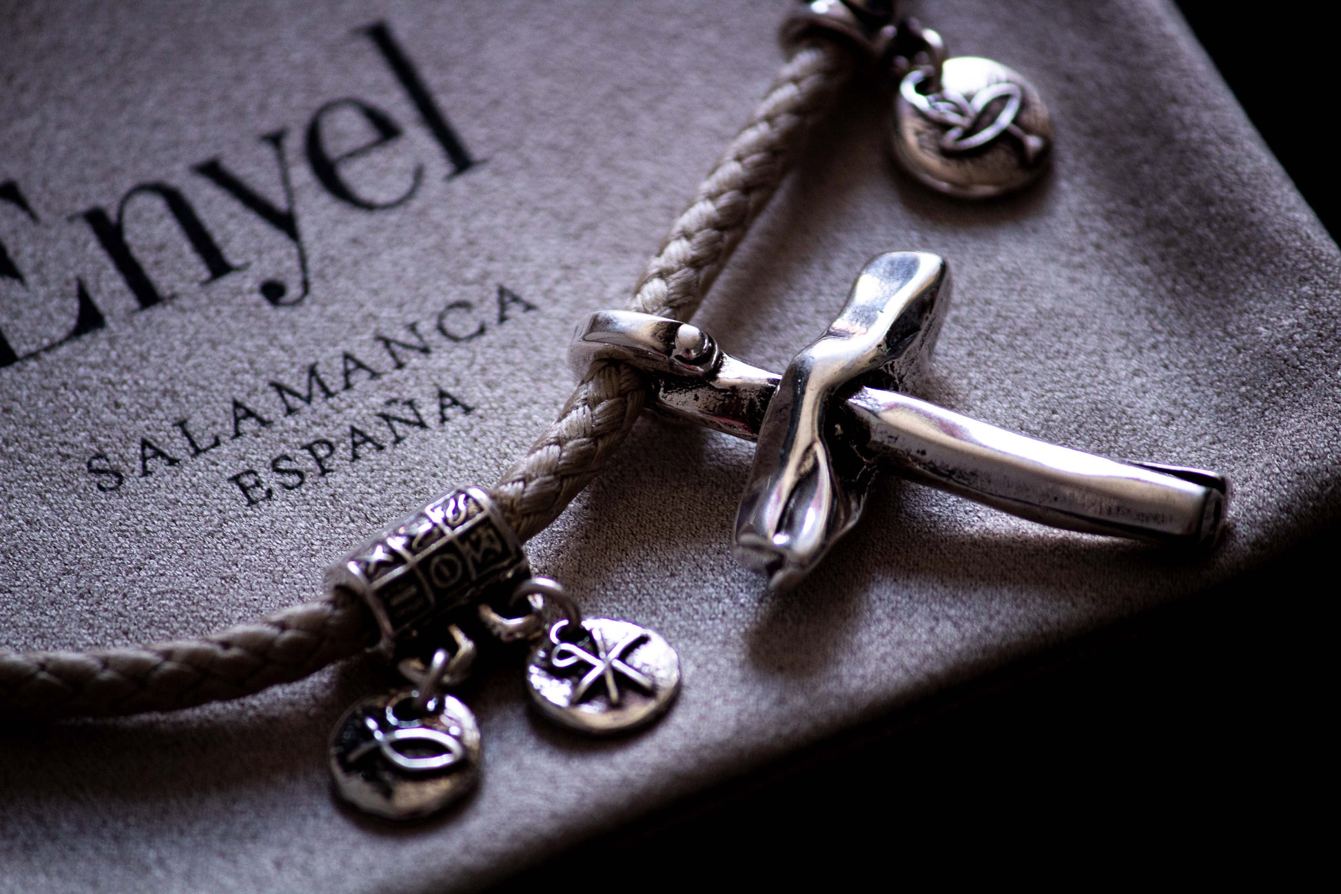 Del cordón sintético cuelgan tres medallitas con simbología cristiana y en los terminales con símbolos de alfa y omega, agregando un toque de significado espiritual.